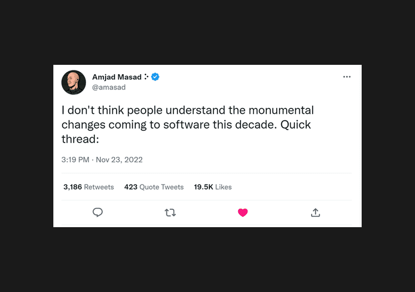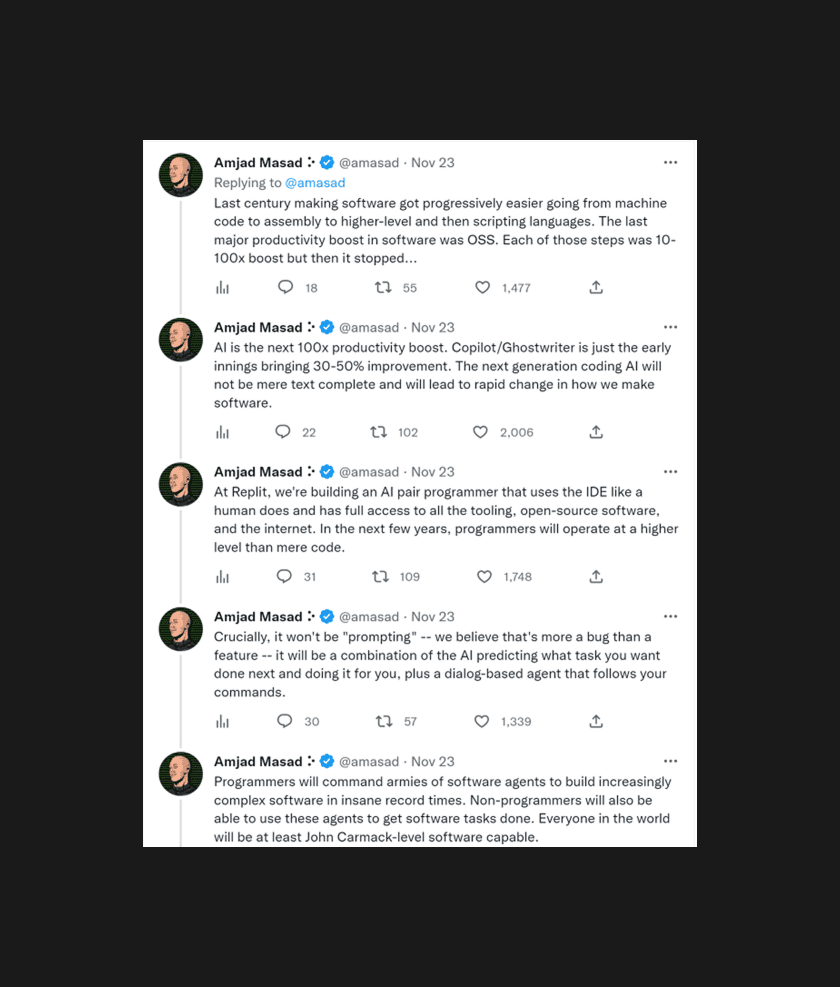 One of the most profound augmentations is the ability to write code. Importantly, the power of these capabilities is now accessible to all, including developers who lack specialized machine learning skills and, in some cases people with no technical background through the advent of low code/no code tooling. Leveraging these foundation models can also reduce the time for developing new AI applications to a level not previously seen. The CEO of Replit, a collaborative tool and AI code generator for software development and emerging unicorn, offers a glimpse into a potential future state enabled by these advancements.